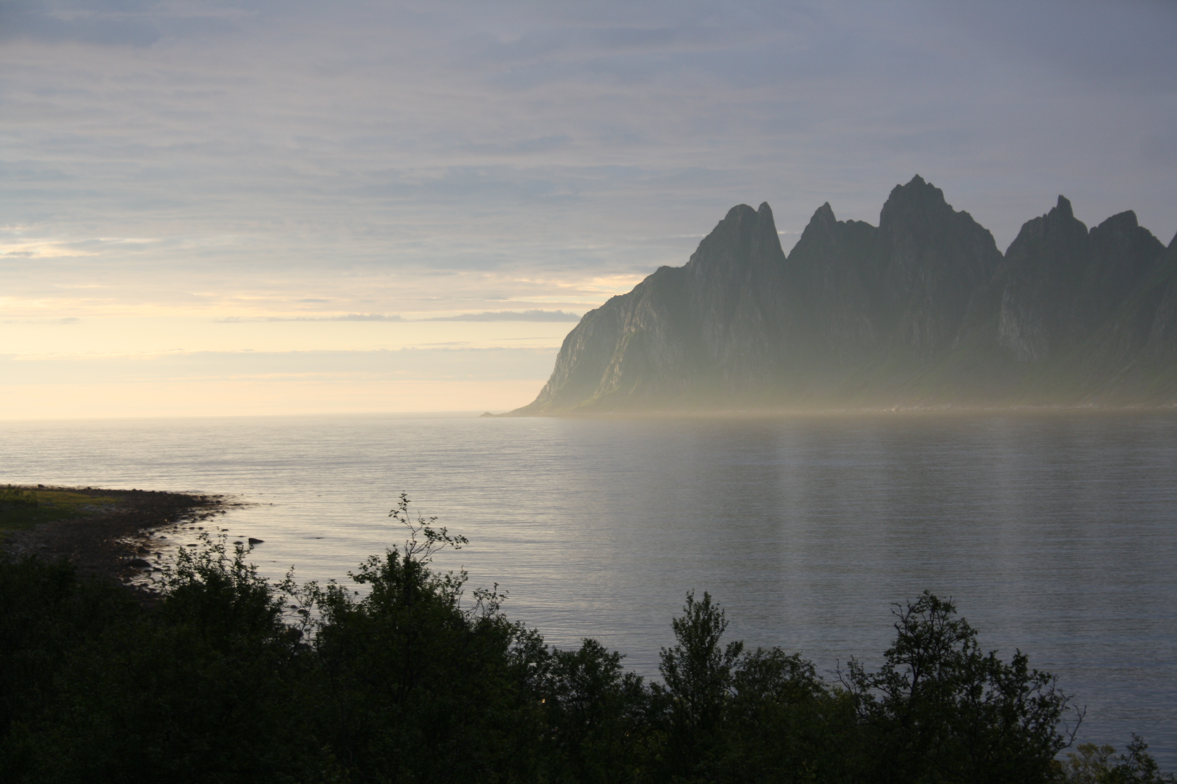 We put up tent on a picnic spot on the north coast of Senja. The soft light lit the haze hanging low at the base of an amazing jagged teeth rock formation. Back at the camp, we saw the sun descend below the clouds: we were going to be bathed in the midnight sun on our own private fjord!