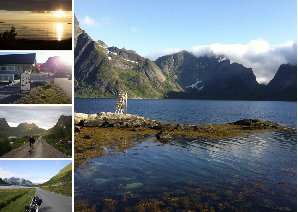 Cycling is an amazing way to visit Norway. Sitting on the bike, there is nothing between you and the elements. The soft rays of the sun warm your skin, the wind ruffles (or blasts) through your hair, the salty breath of the sea enters your nostrils, or the pungent smell of drying fish. Around every bend a new vista opens up: an amazing fjord, breathtaking pointed mountains, deep blue lakes.