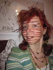 Ich bin Zeichnerin und mein Motto ist jeden Tag eine Linie. Da paßt natürlich das Streifenshirt hervorragend. Auf diesem Bild sitze ich vor meinen Zeichnungen und damit mein Gesicht nicht so blaß ist, habe ich die Streifen mit meinem Lippenstift gleich hochgezogen. 🙂
